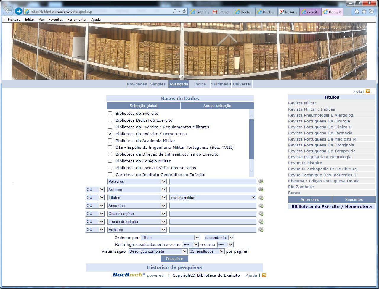 Para consultar a Revista Militar, pode optar-se pela navegação através da coleção Documentos Textuais, seguindo posteriormente para a respetiva subcolecção ou utilizar no Catálogo Coletivo a pesquisa avançada com o termo “revista militar”, no campo titulo (Figura 2).