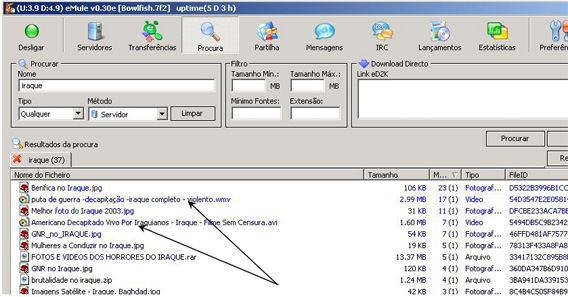 Para o leitor menos atento à realidade da Internet, as últimas afirmações até podem parecer um exagero, no entanto devemos lembrar que os órgãos de comunicação social usam muitas vezes a Internet como fonte de informação10. Um outro dado curioso e sem dúvida mórbido e que de algum modo nos surpreendeu nesta investigação é que, por exemplo, as imagens relativas à execução de prisioneiros no Iraque são distribuídos na Internet podendo facilmente ser obtidos como qualquer aplicação de partilhas de ficheiros tipo eMule ou Kazaa, como se mostra na Figura 4.2, ou seja para além de serem distribuídas a partir de sites dos terroristas são perpetuadas na Internet por utilizadores anónimos.