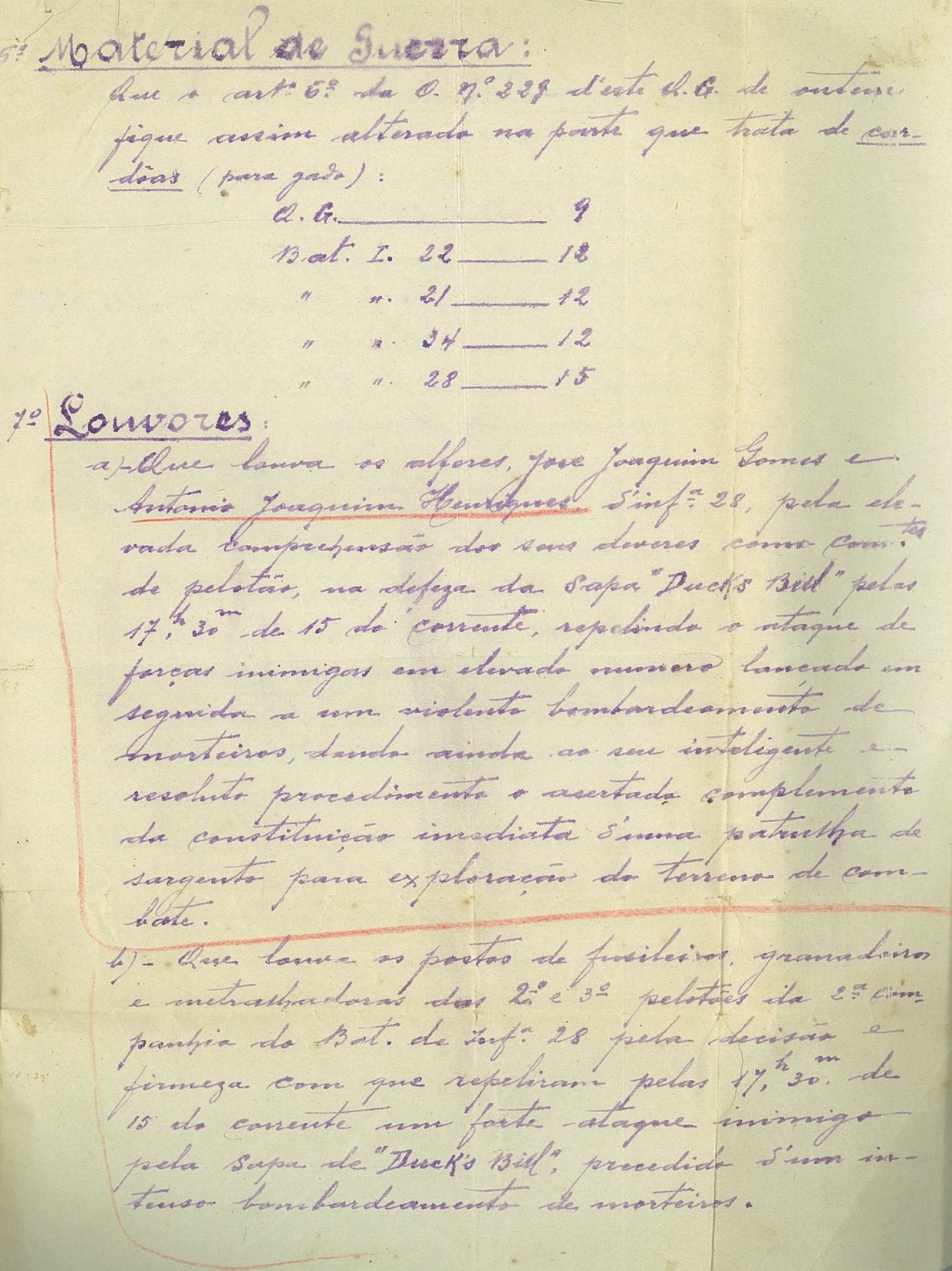 Louvor aos alferes José Joaquim Gomes e António Joaquim Henriques, de Inf.a 28, pela elevada compreensão dos seus deveres como comandantes de pelotão na defesa da Sapa “Ducks Bill” pelas 17h30 de dia 15 do corrente, repelindo os ataques de forças inimigas em elevado número lançado em seguida a um violento bombardeamento de morteiros, dando ainda ao seu inteligente e resoluto procedimento acertado complemento da constituição imediata duma patrulha de sargento para exploração do terreno de combate (este louvor foi publicado também na Ordem do Exército n.º 15 – 2ª Série – de 14 de Setembro de 1920, pagina 670 e seu direito a 2ª condecoração com a Cruz de Guerra de 4ª classe).