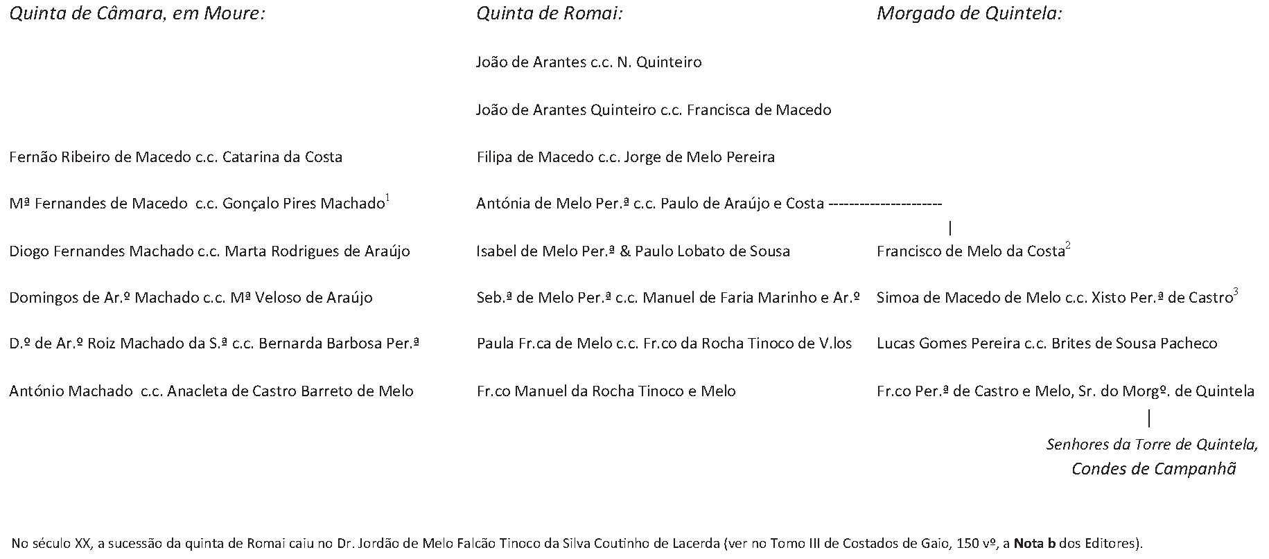 Tanto João de Arantes Quinteiro e D. Francisca de Macedo (de nome completo D. Francisca de Macedo Soares), como Jorge de Mello (ou, mais precisamente, Jorge de Mello Pereira) e D. Filipa de Macedo (ou D. Filipa de Macedo da Cunha), e, bem assim, D. Antónia de Mello Pereira da Cunha e Paulo de Araújo da Costa, são referidos como Senhores da Quinta de Romai no NFP de Gaio, respectivamente, nos títulos de Machados (N21, §168), Araújos (N24, §219), e Costas (N6, §81). O primeiro casal figura, igualmente com esse senhorio, na Árvore 153 do Tomo III de Costados (Machados, Senhores da Quinta de Câmara de Moure), do mesmo autor.