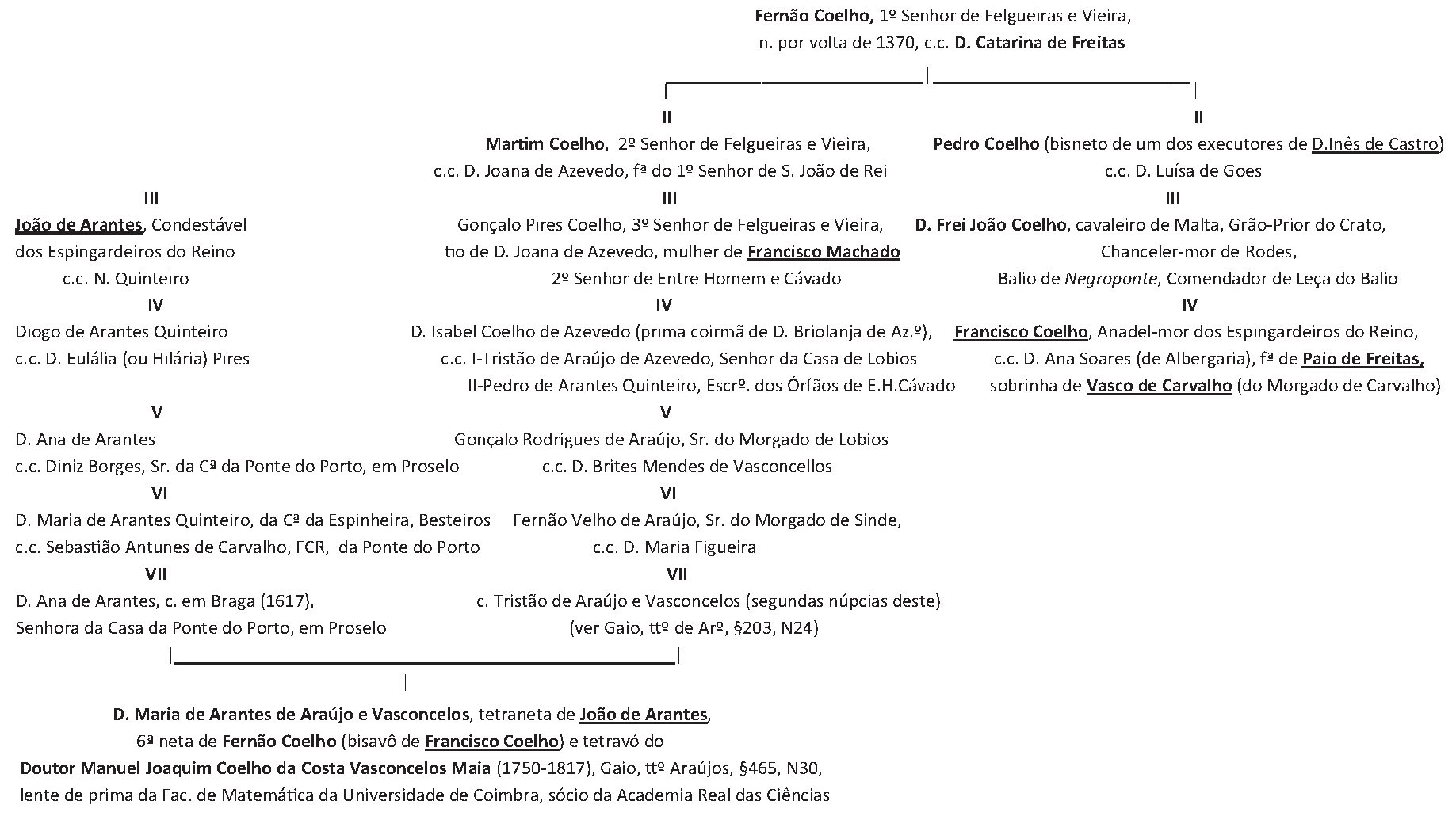 • D. Maria de Arantes Quinteiro (que Gaio diz ser da Casa do Espinheiro, em Besteiros), falecida em 1646, mulher de Sebastião Antunes de Carvalho, “o velho”, moço de Câmara e Fidalgo da Casa de D. Sebastião. Foram pais de D. Ana de Arantes Quinteiro, que lhes sucedeu na Casa do Porto de Proselo e, em 1617, casou com Tristão de Araújo de Vasconcelos, filho de Fernão Velho de Araújo, Senhor do Morgado de Sinde, e neto de Tristão de Araújo de Azevedo, da Casa de Lóbios (que casou com D. Isabel Coelho de Azevedo, filha de Diogo Lopes de Azevedo, 4º Senhor de S. João de Rei). Tiveram D. Maria de Arantes de Araújo e Vasconcelos que casou com João Francisco da Cunha, como se lê em Gaio, título de Araújos, §465. Foram tetravós de Manuel Joaquim Coelho da Costa de Vasconcelos Maia (1750-1817), cavaleiro de Cristo, “lente de prima” da Faculdade de Matemática na Universidade de Coimbra e sócio da Academia Real das Ciências. O APÊNDICE III mostra que os Arantes Quinteiros deste ramo tinham laços de sangue com Coelhos e Freitas que foram Anadéis-mores dos Espingardeiros do Reino.