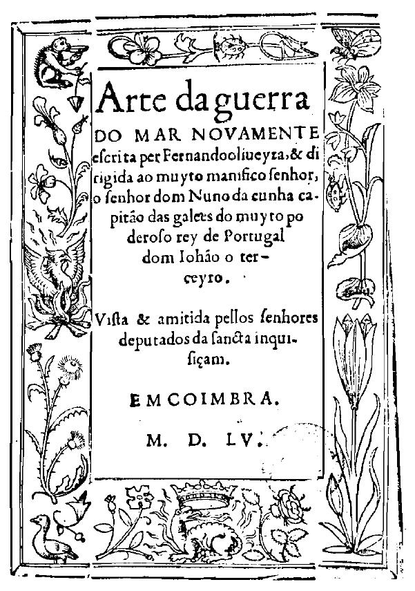[5] Fernando Oliveira, Arte da Guerra do Mar (Coimbra, Portugal: João Alverez, Imprimidor do Rei, 1555). Existem apenas duas cópias do tratado original: uma na Biblioteca Nacional de Portugal e outra na Biblioteca Central de Marinha, ambas localizadas em Lisboa. O livro já foi republicado por quatro vezes: Fernando Oliveira, Arte da Guerra do Mar, com um “Comentário preliminar” de Quirino da Fonseca e um “Comentário à Arte da Guerra do Mar do padre Fernando Oliveira” de Alfredo Botelho de Sousa (Lisboa: Arquivo Histórico da Marinha, 1937); Fernando Oliveira, Arte da Guerra do Mar, com os dois textos introdutórios da edição de 1937 (Lisboa: Ministério da Marinha, 1969); Fernando Oliveira, Arte da Guerra do Mar, com os dois textos introdutórios da edição de 1937 (em português, inglês e francês) e com um fac-simile da edição original de 1555 (Lisboa: Edições Culturais da Marinha, 1983); e Fernando Oliveira, Arte da Guerra do Mar: Estratégia e Guerra Naval no Tempo dos Descobrimentos, com uma introdução (“O Padre Fernando Oliveira: Breve Apontamento Biográfico”) e um estudo (“A Obra: Estudo Introdutório à Arte da Guerra do Mar”) de António Silva Ribeiro, e um fac-simile da edição original de 1555 (Lisboa: Edições 70, 2008).