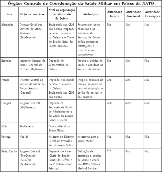A evolução da organização dos Serviços de Saúde Militares conduziu, em todos os países de que possuímos informação e que são referidos neste trabalho, à constituição de um órgão central, junto do Ministério da Defesa e do Estado-Maior General das Forças Armadas, com a designação mais frequente de Direcção-Geral (ou equivalente) de Saúde Militar. No Quadro IV tenta-se expressar, com os elementos recolhidos, o nível a que se encontra na organização do Ministério da Defesa e as respectivas atribuições e competências.