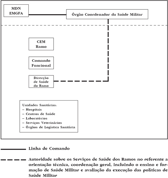 Considerando que a coesão, disciplina e operacionalidade das Forças Armadas assenta na capacidade de exercer a autoridade através dos canais de comando, e não existindo, por enquanto, esses canais que permitam o exercício da autoridade hierárquica e funcional a partir de órgãos integrados no MDN ou no EMGFA, admite-se que, na fase actual, possam ser prosseguidos os seguintes desenvolvimentos sobre o sistema de saúde militar29 (ver Quadro V):