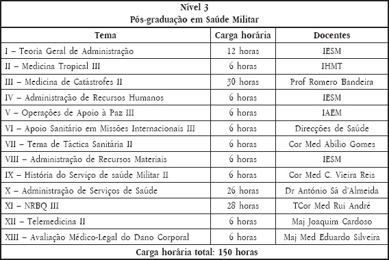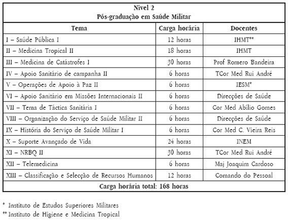 1. Existe um consenso no âmbito dos Serviços de Saúde Militares, no que respeita à importância vital da formação pós-graduada em saúde, bem como à identificação de matérias necessárias para integrar um corpo curricular de Saúde Militar.