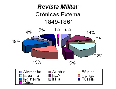 40 A Revista Militar logo no seu primeiro ano de edição começou a publicar Crónicas Externas referentes a pequenas notícias ocorridas em alguns países estrangeiros: organização dos exércitos, conflitos internacionais, expedições, manobras militares, nomeação de ministros da guerra e inventos científicos. Foi ainda durante esta etapa que a publicação das crónicas externas foi interrompida entre os anos de 1853 e 1857 o que poderá estar relacionado com o avultado número de artigos dos seus colaboradores a publicar.