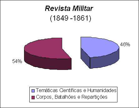 Fonte: A. H. M. Registo estatístico comparativo entre as Temáticas Científicas e de Humanidades com as temáticas estritamente militares, «Corpos Batalhões e Repartições» publicados nos Tomos I a XIII da Revista Militar entre 15 de Janeiro de 1849 e 31 de Dezembro de 1861.