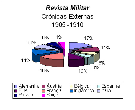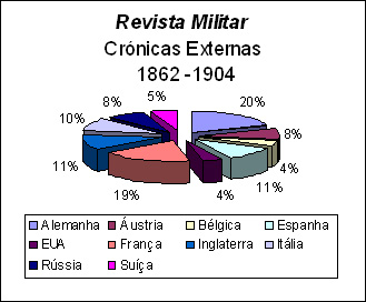 Quanto à rede de comunicabilidade, desde o início da sua publicação que a Revista Militar inclui nas suas páginas crónicas de publicações estrangeiras40. No primeiro ano de edição, destaca-se a Espanha com 12 crónicas publicadas, seguida da França com 6, a Alemanha e Áustria com 3, Rússia com 2 e Inglaterra com 1.