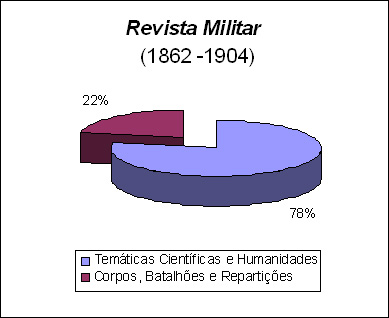 Fonte: A. H. M. Registo estatístico comparativo entre as temáticas científicas e de humanidades com as temáticas de cariz estritamente militar «Corpos, Batalhões e Repartições» publicados nos Tomos XIV a LVI da Revista Militar de 15 de Janeiro de 1862 a 31 de Dezembro de 1904.
