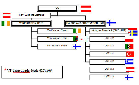 As LOT portuguesas são organicamente constituídas por seis militares do Quadro Permanente do Exército, os quais vivem em casas alugadas nas localidades de Modrica e Derventa (Republika Srpska/BiH). Aquando da sua implantação no terreno em Dezembro de 2004 foram inicialmente constituídas com 3 Oficiais e 3 Sargentos. A partir de Janeiro de 2006 passaram a ser constituídas por 5 Oficiais e 1 Sargento.