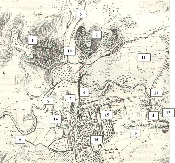 1 - Forte de S. Vicente; 2 - Forte da Forca; 3 - capela de S. João; 4 - Estrada de Runa; 5 - Estrada para o Ramalhal e Caldas; 6 - Ponte “junto à estrada do Ramalhal”; 7 - Castelo de T. Vedras e Igreja de Stª Maria; 8 - Estrada para Mafra; 9 - Encosta do Varatojo; 10 - Capela do Amial; 11 - “Sarges”; 12 - “Fontainhas”; 13 - Ponte do Rei; 14 - “Alpilhão”; 15 - Igreja de S. Pedro; 16 - Hospital da Misericórdia.