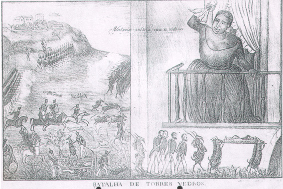 “Batalha de Torres Vedros(sic)” Reprodução de uma estampa existente no Arquivo Municipal de Torres Vedras. Sabemos existir uma gravura igual na Biblioteca Nacional de Lisboa. Desconhecemos qual delas é a original. Note-se a figura da rainha, as cabras (os “cabralistas”) e a figura por elas transportada numa maca (Mouzinho?). “Quando a rainha soube da morte e aprisionamento dos bravos, saiu às janelas do palácio e como uma bacante gritou para a sua guarda: “Vitória! Vitória! Vitória” (Espectro, citado por Oliveira Martins).