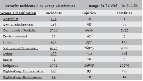 Apresentamos alguns gráficos extraídos da Terrorism Knowledge Base.. Esta base de dados é uma boa ferramenta analítica e permite criar não só gráficos como tabelas sobre incidentes terroristas. Aqui damos apenas o exemplo de gráficos com o registo do número de mortos e feridos por ano e depois por região: