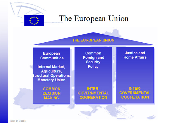 A UE está assente em três pilares, o primeiro pilar é o pilar supranacional, onde se estabelecem as Directivas Comunitárias, as Normas e as Decisões que são propostas pela Comissão e que serão transpostas obrigatoriamente para os diversos Estados Membros. O 2º Pilar (PESC e PESD) e o 3º Pilar (Justiça e Segurança) são áreas da Competência do Conselho da UE, são áreas Intergovernamentais, os Estados Membros têm o poder de decisão e a maioria das decisões têm de ser tomadas por consenso.
