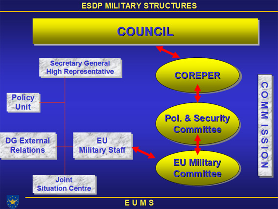 No caso concreto dos Grupos da PESD exclusivamente Militares os Estados Membros não exercem a Presidência do EUMC nem do EUMC WG, uma vez que existem em permanência dois Presidentes nomeados, respectivamente um Oficial General de quatro estrelas e um Oficial General de duas estrelas. Só no EUMCWG/HTF, grupo de trabalho dependente do EUMC para desenvolver as Capacidades Militares da PESD de acordo com o “Capabilities Development Mechanism”, a Presidência é exercida pelo Estado Membro que a exerce.