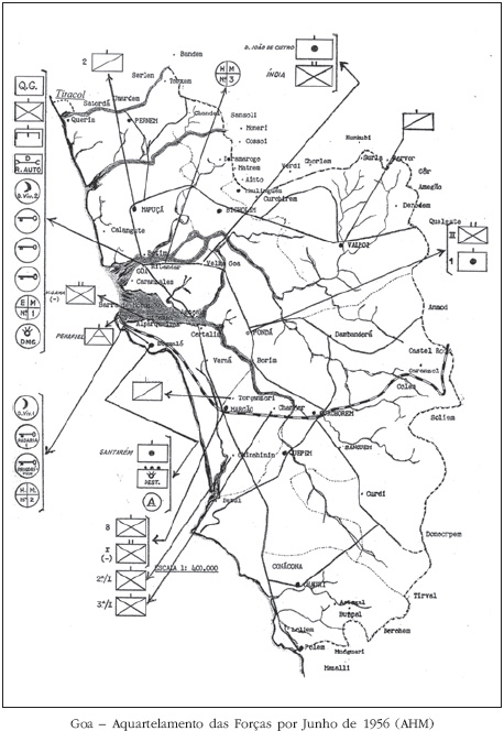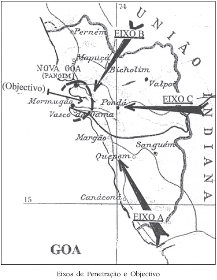 (É de referir desde já, até por razões a seguir apontadas, que, inteiro conhecedor da nossa Ordem da Batalha nos três distritos e do esquema geral do seu emprego no terreno, as Forças Armadas da União Indiana montaram em Goa uma manobra terrestre, apoiada por meios aéreos, na qual, realizando a surpresa, contrariaram a manobra do Plano “Gralha” e doutros como o Plano “Sentinela”, que se lhe seguiram. Foi essa manobra a de utilizarem efectivamente como um dos principais Eixos o de norte, por Bicholim, directo a Pangim, de não se empenharem em força no Eixo de Sul, por Polém e Margão, e de montarem um segundo esforço sobre Pondá, o qual, em conjugação com o principal, o de Bicholim, lhe permitiu correr sobre Mormugão e “cortar” a meio o território do distrito e a estrutura da defesa montada, atingindo rapidamente, também pela menor distância a vencer, o seu Objectivo.