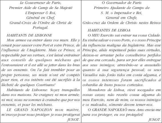 Esta proclamação tinha sido mandada afixar pelas ruas e praças de Lisboa na madrugada daquele dia 30 de Novembro de 1807, tanto em francês como em português, para que não restassem dúvidas. Fazemos nossas as palavras de José Acúrcio das Neves e transcrevemos também a proclamação em francês: “[...] a peça é tão interessante, tão extraordinária [...] que eu não posso dispensar-me de a transcrever toda inteira, [...].” 25: Vejamos o que disse Junot:
