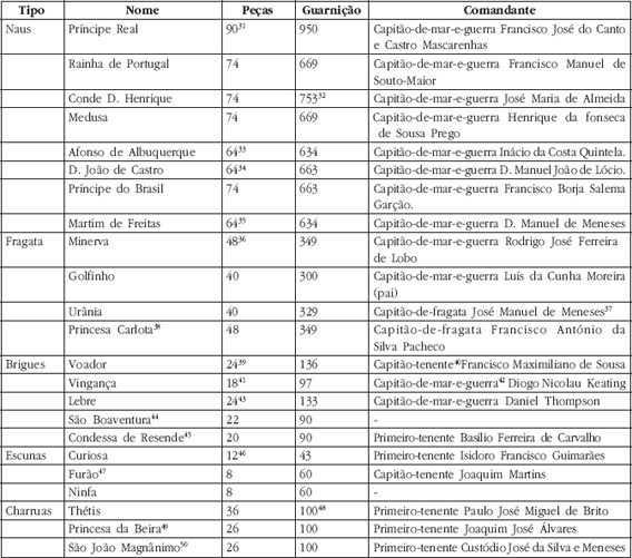 Segundo José Acúrsio das Neves, a esquadra portuguesa era composta de oito naus, três fragatas, três brigues, uma escuna e o seu comandante-em-chefe era o Vice-Almirante. Este número de navios não é unânime para todos os autores onde o assunto é debatido, conforme iremos ver na tabela30 que se segue:
