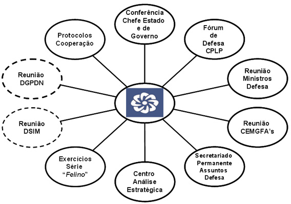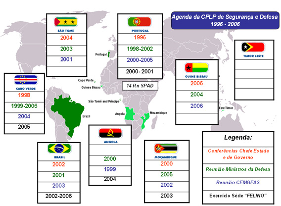 As Reuniões dos Ministros da Defesa e de Chefes de Estado-Maior General das Forças Armadas (CEMGFA) da CPLP, constituem os órgãos de decisão e de acompanhamento das acções desenvolvidas pela Comunidade no âmbito da Segurança e da Defesa, constituem um fórum de discussão e troca de informações privilegiada sobre as preocupações relativas às problemáticas da segurança nos Estados-membros. Neste sentido, desde a 1ª Reunião de Ministros da Defesa, em 199822, têm sido realizadas anualmente nos vários países da CPLP (Figura 3), reuniões que visam contribuir para o evoluir da componente da cooperação nesta área específica. Até ao final de 2007, levaram-se a efeito dez reuniões, tendo a reunião de 2007, ocorrido em Angola. Neste âmbito, a recente reunião realizado em 12 de Setembro de 2006, em Cabo Verde, foi considerada das mais importantes, pois foi onde se aprovou “condicionalmente”, o importante “Protocolo de Cooperação dos Países de Língua Portuguesa no Domínio da Defesa”, que abordaremos em seguida.
