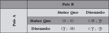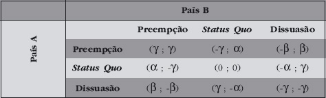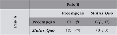 Na tabela 1 ambos os países enfrentam duas possíveis decisões: ou preempção, ou inacção. Se o país B decidir implementar, isoladamente, medidas proactivas, ele irá ter um payoff líquido de –g (resulta de um benefício de a, a um custo associado de b), e o país A um payoff líquido de a (benefício resultante do outro país ter tomado medidas preemptivas). Caso seja o país A a desenvolver medidas preemptivas, a leitura será a inversa. Se ambos actuarem de forma proactiva, irão juntos beneficiar dos ganhos associados às duas operações, suportando somente os custos da sua operação, resultando um net payoff de g para ambos. Daqui resulta um Dilema dos Prisioneiros com a inacção a ser a estratégia dominante26. Assim, o Equilíbrio de Nash27 é (status quo; status quo), sendo dominado por (preempção; preempção).