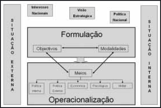 Relativamente ao emprego de recursos, a estratégia pretende estabelecer a ponte entre a realidade actual e um futuro desejado. Envolve o cálculo disciplinado para atingir objectivos, formular conceitos e utilizar recursos dentro dos parâmetros de risco a fim de criar as condições que provavelmente não existiriam se nada fosse feito. No contexto do Estado, a estratégia envolve o emprego dos instrumentos de poder para alcançar os objectivos do Estado através de relações de cooperação ou competição com outros actores, que perseguem - possivelmente conflituais - também os seus objectivos.15 Esta definição mostra que a estratégia se subordina à natureza do ambiente estratégico, o qual é dinâmico e competitivo.