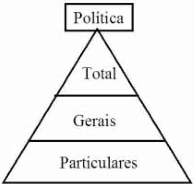 Da pirâmide conseguimos inferir o seguinte: A estratégia total ou global é decidida ao mais alto nível do estado e está directamente ligada às directrizes políticas definidas; as estratégias gerais derivam das missões atribuídas pela estratégia total e segundo os instrumentos de poder podem dividir-se em económica, diplomática, militar, etc., encontrando a sua definição ao nível dos ministérios (nível de conduta); as estratégias particulares são divisões das estratégias gerais, como por exemplo estratégias militares terrestre, naval e aérea, que são definidas e emanadas através dos departamentos que constituem os ministérios. Mas a estratégia não se limita ao emprego dos instrumentos de poder. Deve gerar os meios (estratégia genética),29 estruturá-los (estratégia estrutural)30 e empregá-los (estratégia operacional).31