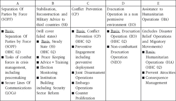 No Catálogo anterior, HHC 2003, só estavam definidos os Cenários de Separação de Partes pela Força, Prevenção de Conflitos e Assistência Humanitária12, pelo que o número de Requisitos era menor13 do que o actual que define cinco cenários de planeamento.