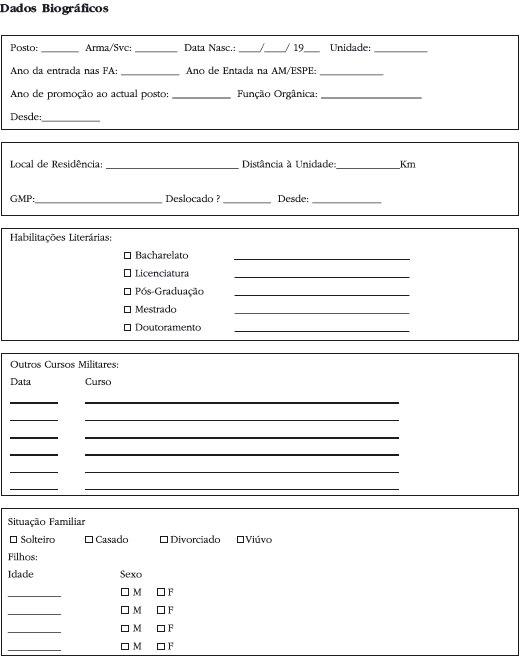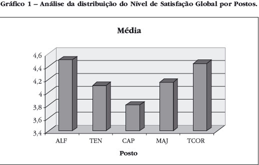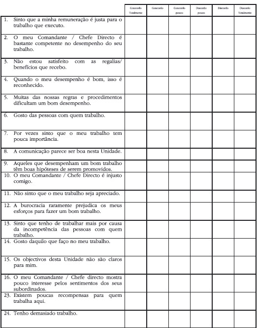 Assim, para medir a Remuneração e Benefícios, foram eleitos os itens 1 e 3. Para medir a Promoção os itens 9, 28 e 32. Para medir o Grau de Reconhecimento, os itens 4, 11, 23 e 31. Para medir o Relacionamento com o Superior Directo os itens 2, 10, 16, e 29. Para medir o Relacionamento com os Camaradas os itens 6, 13 e 25. Para medir o Comando e a Forma de Organização da Unidade os itens 5, 7, 8, 12, 14, 15, 26, 30, 33 e 35. Finalmente e para medir a sua auto-percepção, os itens 24, 37 e 34.