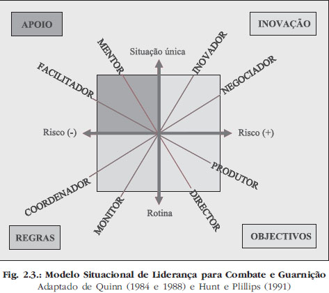 Este modelo situacional de liderança militar baseia se na frequência esperada de determinados acontecimentos e no risco que lhe está associado. A partir de um sistema de eixos ortogonais (eixos XY), formando quatro quadrantes, são representadas duas dimensões diferentes mas relacionadas entre si (frequência e risco), as quais permitem um esquema de referência para posicionar e distinguir várias situações ou diferentes missões passíveis de serem atribuídas aos líderes militares, podendo ir desde o combate propriamente dito (quadrante I), a uma situação típica de guarnição (quadrante III).
