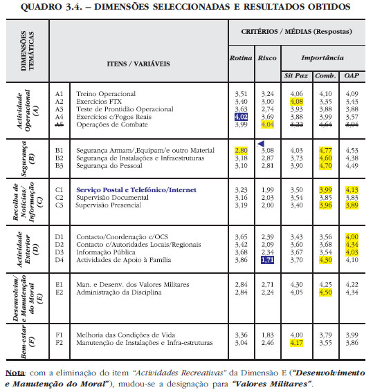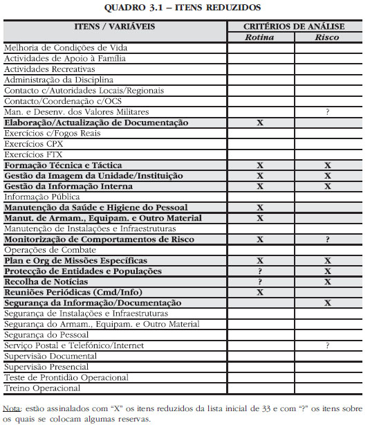 - Uma segunda secção, dedicada à identificação de actividades/missões características de cada situação tipo (tarefas gerais e responsabilidades dos comandantes/chefes militares), de acordo com três critérios: rotinização, risco e importância das tarefas; nesta secção foram usadas exclusivamente perguntas fechadas e uma escala intercalar de tipo Likert com cinco graus de intensidade para um mesmo item: de Mínima(o) rotina/risco/importância a Máxima(o) rotina/risco/importância, considerando ainda os graus intermédios baixa(o), moderada(o) e alta(o).