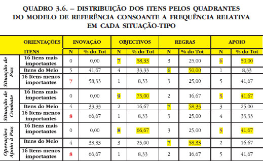 Uma primeira leitura do Quadro 3.6. leva nos a concluir que os comportamentos de liderança são sobretudo orientados para os OBJECTIVOS, ou seja, é esta a orientação que assume maior relevância nas três situações tipo. A orientação INOVAÇÃO é, por outro lado, a que tem menor relevância também nas três situações, contrariando o sugerido por Hunt e Phillips (1991) particularmente no que concerne à situação de combate. A distribuição dos itens correspondentes à orientação APOIO demonstra que é grande a relevância que lhes é atribuída pelos inquiridos. A orientação REGRAS assume uma relevância média nas três situações tipo.