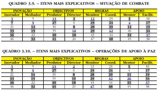O Quadro 3.5 mostra a distribuição inicial (no questionário) dos itens da Secção III pelos papéis e orientações teóricas dos modelos de referência. Cada papel é representado por seis itens/variáveis, sobre os quais os oficiais inquiridos se pronunciaram, a partir dos três cenários definidos para este estudo: situação de paz, situação de combate e operações de apoio à paz. Conforme decorre dos modelos de referência, os oito papéis de liderança agrupam se em quatro orientações, correspondentes à representação gráfica de quatro quadrantes do sistema de eixos ortogonais.