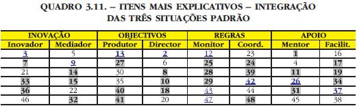 Ao optarmos pelos itens 10 (papel DIRECTOR), 24 (papel COORDENADOR) e 1 (papel MENTOR) como os terceiros itens mais explicativos no âmbito das três situações padrão, a solução é a que se apresenta no Quadro 3.11.