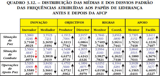 A leitura do Quadro 3.12. sugere que em sete dos papéis de liderança a variação das diferenças nas médias, antes e depois da AFCP, segue a mesma orientação/direcção (ascendente ou descendente) para as três situações padrão do estudo. A excepção ocorre no papel INOVADOR, em que a média desce ligeiramente em situação de combate, aumenta ligeiramente em OAP e sofre um aumento significativo em situação de paz, em sentido oposto ao que é assumido por Hunt e Phillips (1991).