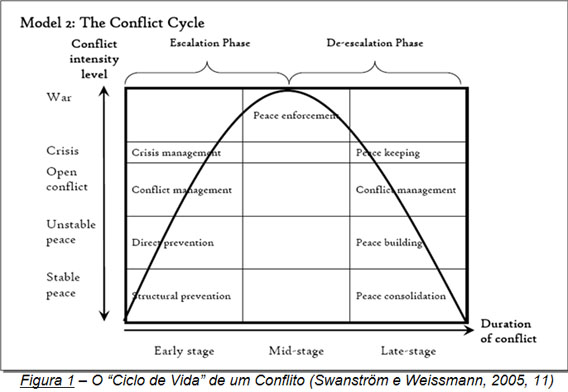 Uma das bases conceptuais de partida para se analisar um conflito é recorrendo ao «ciclo de vida do conflito», constituindo-se como modelo de análise que sintetiza o evoluir do conflito e traça as linhas mestras da intervenção em prol da pacificação do mesmo. Neste modelo pressupõe-se, entre outros aspectos, uma abordagem às suas raízes (causas) mais profundas (rootcauses), especialmente em relação aos actores envolvidos, aos litígios em causa, às estruturas de oportunidade, à interacção estratégica conjuntural e a própria dinâmica do conflito. Factores estes que ao se associarem, tornam a detecção das causas que deram origem a um conflito, num completo “puzzle” de hipóteses. Facto que nem sempre tem contribuído para um correcto entendimento do mesmo por parte da Comunidade Internacional, pois, sem se saber concretamente as causas de um determinado conflito, tendo a mesma base conceptual, não faz sentido falarmos em gestão, prevenção ou resolução do conflito. Enquanto a prevenção de conflitos tem como objectivo acções de longo prazo, tendentes a evitar o surgimento ou a escalada do diferendo ou contencioso, assentando em grande medida, na diplomacia preventiva e no pré-posicionamento de forças militares, a resolução, acontece em estágios mais adiantados do ciclo de vida do conflito, quando este ultrapassa o limiar da violência e se pretende alinhar as desavenças entre as partes em conflito, no intuito de preferencialmente pela via do diálogo, restabelecer a paz e desacelerar a curva do ciclo de vida do conflito.