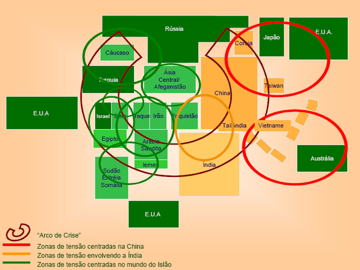 • Crescimento da importância estratégica de um “Arco de Crise” que engloba a Ásia Central, o Médio Oriente, o Golfo Pérsico, a Ásia do Sul e a Ásia-Pacífico (Coreias, estreito da Formosa e Mar do Sul da China), em detrimento da importância estratégica central do continente europeu, característica do período da “guerra fria”;