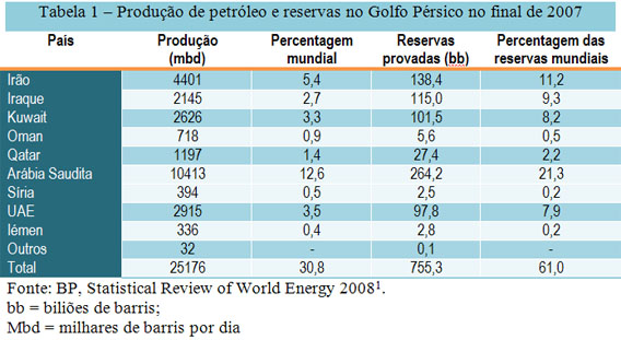 Os números da tabela falam por si, no Golfo Pérsico encontramos cinco produtores principais e vários secundários. A melhor forma de classificar os países é pelas reservas provadas. No topo da lista está a Arábia Saudita, com 264,2 biliões de barris (bb), o que representa cerca de 21,3% das reservas mundiais. Segue-se o Irão (138,4 bb), o Iraque (115 bb), o Kuwait (101,5 bb) e os Emiratos Árabes Unidos (97,8 bb). Realça-se a importância do Iraque, que detém reservas provadas correspondentes a 9.3% das reservas provadas mundiais. Estes são valores do relatório estatístico da BP referentes ao final de 2007. Em 1999, o Iraque constava como segundo país da região com mais reservas. No Irão foram entretanto descobertas mais reservas, passando 89,7 bb para 138,4 bb.