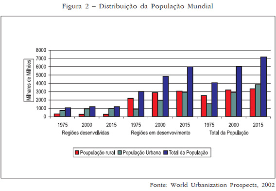 A urbanização no mundo tem evoluído muito, prevendo-se que em 2015 a população mundial a viver em áreas urbanas ultrapasse a população a viver em zonas rurais. Verifica-se, também, que nas regiões desenvolvidas a população urbana é superior à rural desde 1975, ao invés nas regiões em desenvolvimento a população urbana só será idêntica à rural em 2015 e superior à rural depois desta data, figura 2.