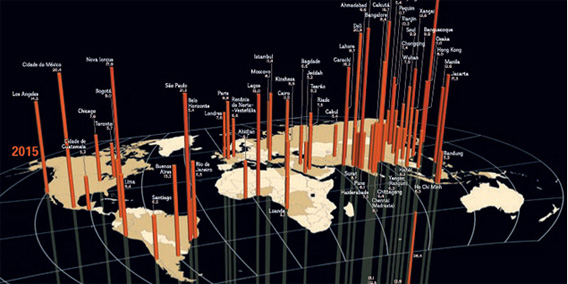Conforme dados recentes das Nações Unidas, nos próximos 15 anos várias Megapolís atingirão a marca de mais de 10 milhões de habitantes e, salvo excepções como Tóquio e Nova Iorque, a imensa maioria localizar-se-á em países com altíssimas taxas de miséria e de desigualdade social. Em 2015, mais de 15 milhões de habitantes viverão em cidades como Lagos (Nigéria), Dacca (Bangladesh), Calcutá e Deli (Índia), Jacarta (Indonésia), Carachi (Paquistão), Cidade do México (México) e São Paulo (Brasil); World Urbanization Prospects, 2002). Prevê-se que nesta data existam 58 Megapolís8, a grande maioria na Ásia, figura 5.