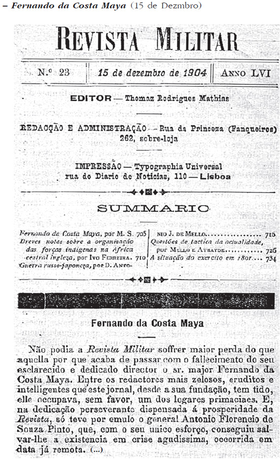 Esta notícia do falecimento do Major da Cavalaria, Fernando da Costa Maya, contém algumas passagens donde se pode inferir turbulência susceptível de poder provocar a profunda alteração no funcionamento da Revista Militar ocorrida logo no mês seguinte, dando-se início à 2ª Época.
