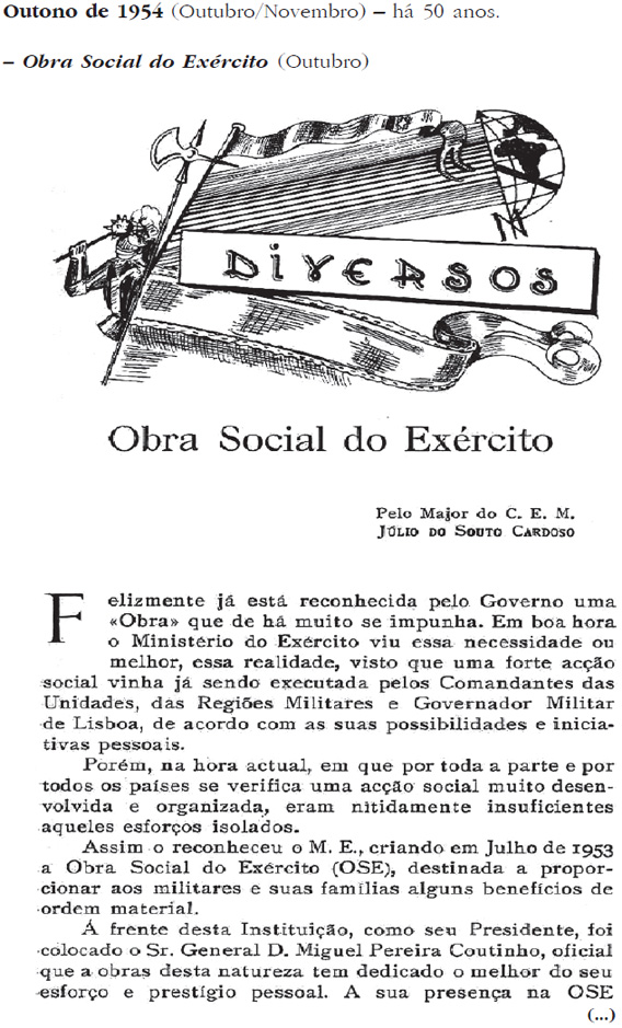 Em 1954, no Outono de há cinquenta anos, destacou-se a Obra Social do Exército, cujo primeiro Presidente foi o General D. Miguel Pereira Coutinho, havendo outros trabalhos de Oficiais do CEM.