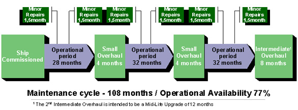 Um dos mais importantes Indicadores Chave de Desempenho (KPI - Key Performance Indicators) das marinhas modernas é a disponibilidade operacional dos navios da sua esquadra, i.e. a percentagem de tempo do ciclo de vida destes navios em que estão disponíveis para realizar missões operacionais. Este KPI é periodicamente afectado pela necessidade de imobilizar o navio para efeitos de revisão, com vista a repor as suas capacidades operacionais normais. Seguidamente podemos ver que num ciclo de manutenção de 108 meses a disponibilidade operacional média de uma fragata é restringida para 77% devido, unicamente, aos períodos de manutenção planeada (não considerando outras avarias imprevistas que levem à paragem do navio).