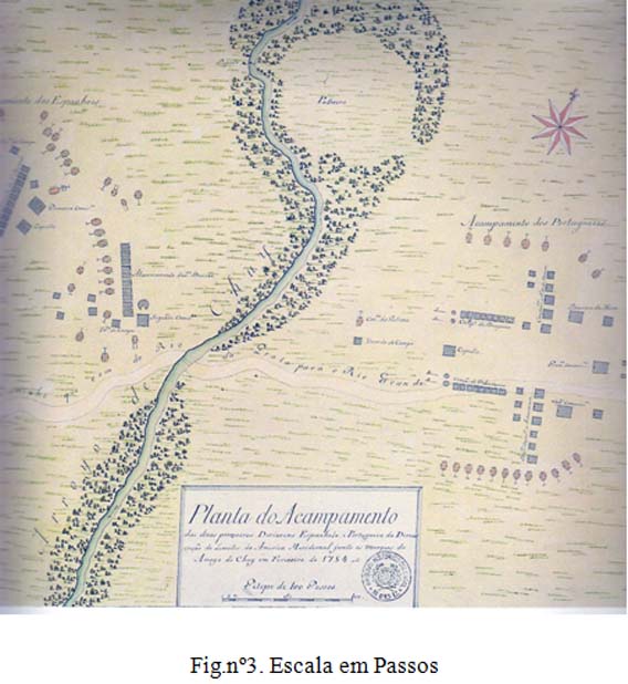 Hua cadea de arame, dividida por humas argolinhas de dez em dez palmos ou pés.Os lados se medirão no papel por hua linha dividida em partes iguais a que chamão Escala ou Petipé, a qual representa o mesmo género de medidas que forão tomadas no terreno, como por exemplo palmos, pés ou braças.