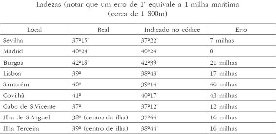 Na biblioteca de Évora pode ver-se um códice que trata experimentalmente dos erros das cartas resultantes desse tipo de avaliações, onde Duarte Pacheco10 apresenta latitudes (ladezas), para diferentes pontos da Terra tendo sido escolhidos os referentes a Portugal e Espanha.