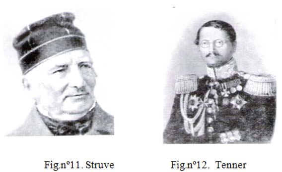 Entre 1816 e 1831 os geómetras F. G. Struve32 e Tenner33 conseguiram medir o arco do meridiano entre o Cabo Norte (Noruega) e o Mar Negro (Rússia). Struve obteve para o grau do meridiano o valor de 57.144 toesas (11.375,747m) depois de juntar os seus cálculos com os de Tenner, o qual fez a parte sul do trajecto, quase todo na Rússia de então. No entanto é de atender que cada geodeta usava um talão de medida diferente.