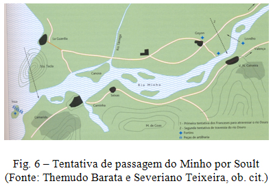 35 Os relatórios franceses continham ainda informações sobre as vantagens e inconvenientes das possíveis áreas de penetração em Portugal, recomendando Valença, Chaves e Bragança como as melhores e reconheciam os obstáculos do rio Minho e das elevações do Nordeste transmontano como difíceis de transpor. As recomendações feitas a Soult sobre a melhor «porta de entrada» em Portugal recaíram sobre Chaves. Contudo, Soult executou várias tentativas para transpor o Minho visando iludir as tropas portuguesas sobre a verdadeira entrada escolhida: Joaquim Veríssimo Serrão, História de Portugal, vol. VII, Lisboa, Editorial Verbo, 1989.