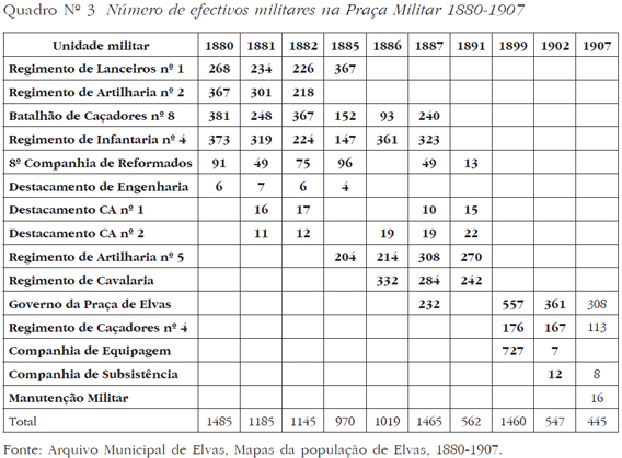 Na verdade, a reorganização do exército levada a cabo em 1884 foi determinante para a perda de importância da praça enquanto espaço de estacionamento militar. Porque a partir dos anos noventa, as unidades com função militar são já pouco significativas e a maior parte dos seus efectivos exerciam actividades com serviços e tarefas administrativas. Por último, interessa referir que a presença significativa de efectivos militares na Praça elvense antes de finais do século XIX (1886, 1887 e 1889), se deveu ao estacionamento temporal de forças como o Regimento de Cavalaria nº 1 e a Companhia de Equipagem, que por aquelas datas estavam mobilizadas para as Campanhas de África que se desenrolaram nos fins de Oitocentos. Assim, quando chegamos aos inícios do século XX a cidade militarizada e considerada desde sempre como “Sentinela da Fronteira” era, sobretudo, um lugar de simples estacionamento militar e não tanto já um espaço onde a presença dos militares fora significativa, como havia ocorrido em finais do séc. XVIII e durante as Guerras Peninsulares.