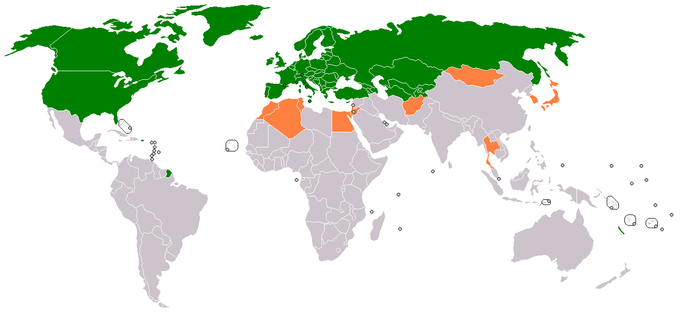 Países membros da OSCE (56, todos do hemisfério Norte) e Associados para a cooperação (Afeganistão, Mongólia, Japão, República da Coreia e Tailândia) bem como os Associados Mediterrâneos para a Cooperação (Argélia, Egipto, Israel, Jordânia, Marrocos e Tunísia).