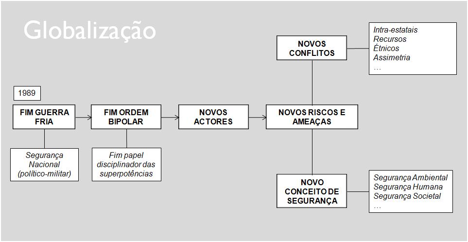 O inimigo não é identificável, as ameaças são inquantificáveis e o equilíbrio internacional é imprevisível, imperando as entidades caóticas ingovernáveis, estatais e não estatais, que fazem com que os riscos sejam múltiplos, difusos e globais. As ameaças que pairam sobre o mundo são agora de vária ordem, identificando-se as de carácter político-estratégico e as mais vincadamente sócio-políticas. Em relação às primeiras, existem o reacender dos nacionalismos reprimidos, as questões fronteiriças, a disputa pela posse ou acesso a recursos naturais não renováveis, como o petróleo e a água potável, e o perigo de proliferação de armas de destruição em massa. Quanto aos segundos, temos as pressões sociais e políticas provocadas pelos desequilíbrios económico-demográficos e consequentes fluxos migratórios, os radicalismos político-religiosos e político-étnicos, com os fundamentalismos, xenofobias e racismos, e também as actividades de grupos de terrorismo, de narcotráfico e de crime organizado.