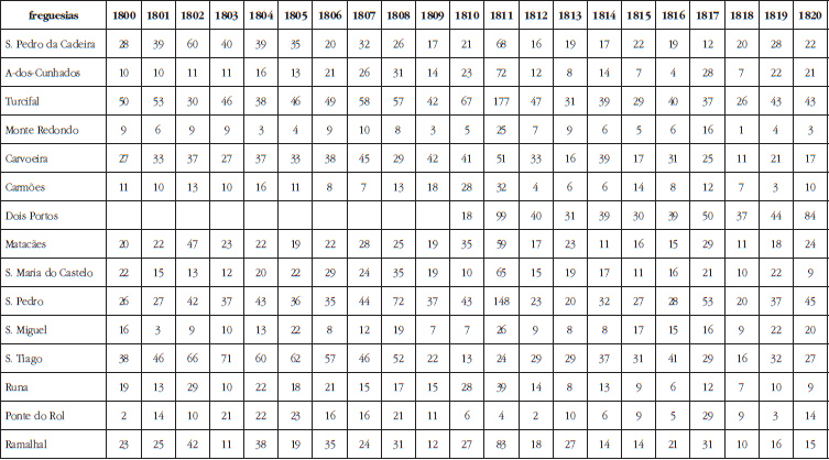 Foram muitas as pessoas que procuraram refúgio em zonas mais a sul, mas muitas também se concentraram no concelho de Torres Vedras, alargando-se por todo o seu espaço. Vejamos exemplos no quadro I.